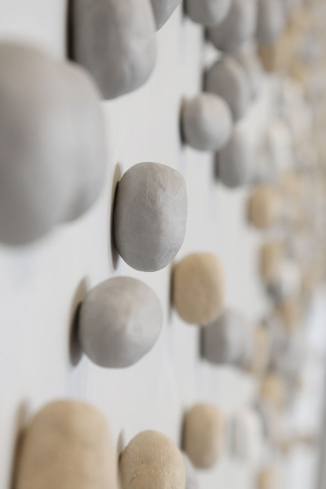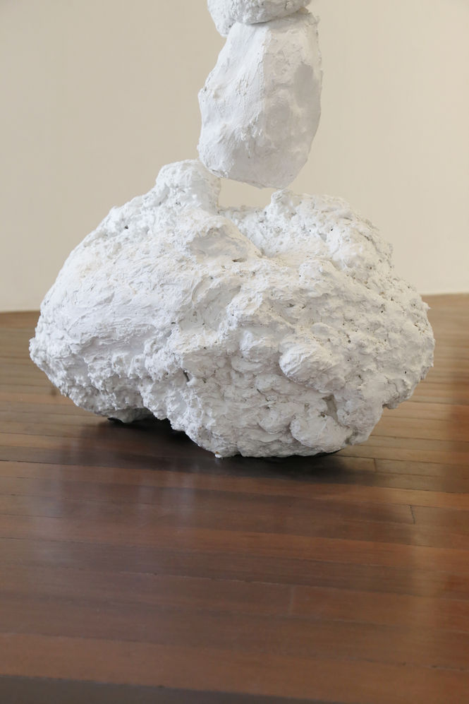 Acúmulos e arranjos de formas imperfeitas oscilam entre a arqueologia dos fragmentos coletados e a cosmogonia construída pelo depósito de matérias que insistem em buscar alguma aderência entre si. Parece haver uma inquieta manipulação sempre a desafiar aquela que deveria ser a espessura apropriada para fixação nesse sistema de pesquisa por metamateriais. Os sólidos tornam-se fluidos por atuação mecânica e itens heterogêneos encontram sua estabilidade momentânea em estruturas de equilíbrio ou encaixe. Partículas sobrepostas aglutinam-se e assumem propriedades de um corpo contínuo. Sinto que existe um equivalente arquitetônico familiar ao mundo biológico para essas construções de espuma e cimento aqui decorrentes de uma interface borrada entre bolhas petroquímicas e a mecânica granular.